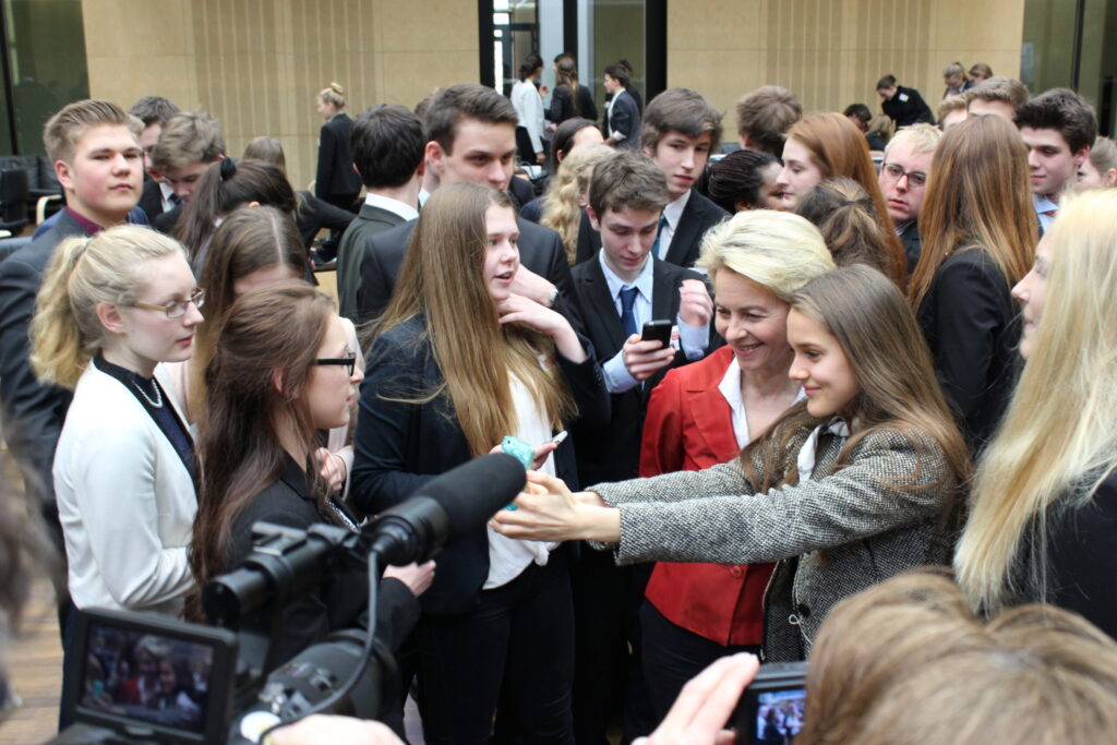 Wichtiges Element der Sitzungen ist immer auch die Diskussion mit politischen Entscheidungsträger:innen. So bekommen die Delegierten ein erstes Feedback zu ihren Resolutionsvorschlägen. Oft laden wir die jeweiligen Bundesratspräsident:innen ein. Manchmal haben wir auch das Glück, mit amtierenden Minister:innen zu sprechen, wie 2015 mit der damaligen Bundesverteidigungsministerin Ursula von der Leyen.
